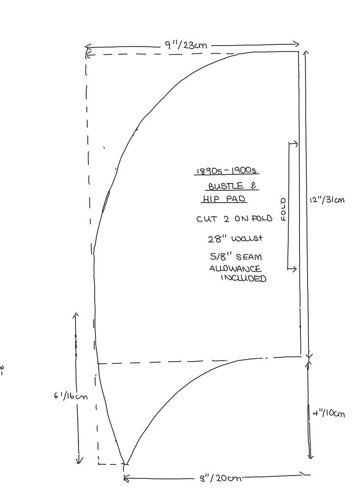 I drafted my own pattern based on the examples and adapting an existing pattern I made to my waist measurements for an eighteenth-century bum pad. It should work for several sizes. It is designed to come around your waist to add a little to the hips as well, like in the illustration to the patent.