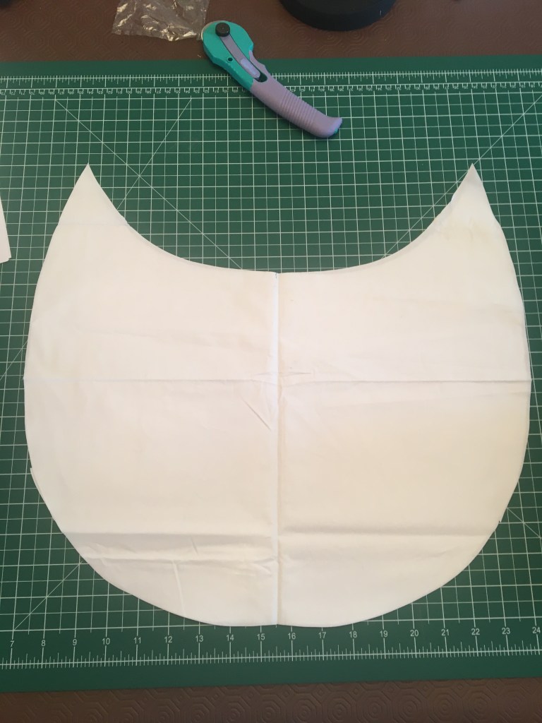 Step One: Cutting. After drafting the pattern, cut two pieces on the fold. I used some white glazed cotton chintz that I had in my stash. Then cut the same shape from the batting.