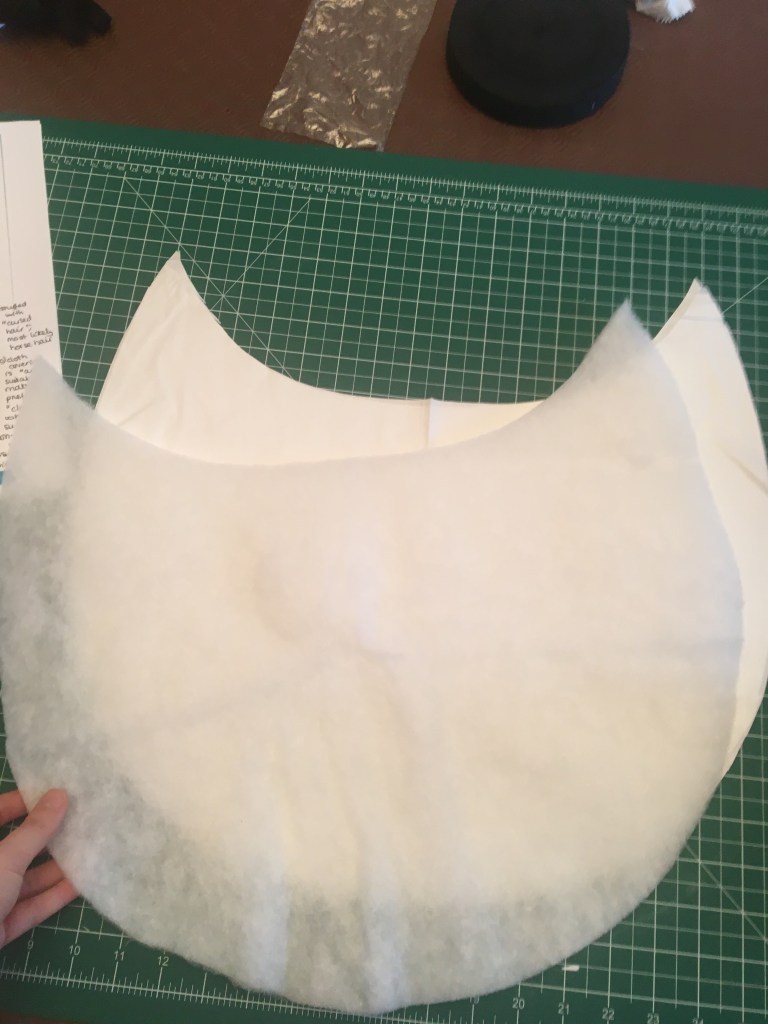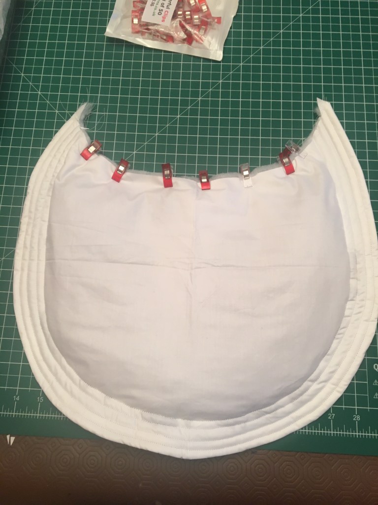 Step Two: Assembling. Place the outer fabric pieces right-side together and then place the batting piece on top. Pin together and then sew around the outer edge, leaving the top open. Clip the curves, turn right-side out and press. Note: When stuffing the bustle, put the stuffing on top of the batting to create a domed shape. The flat side will go against the body and the stuffing will be towards the outside to create the desired shape. The original did not do this as far as I know, but it makes the quilting easier.