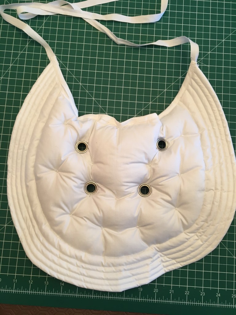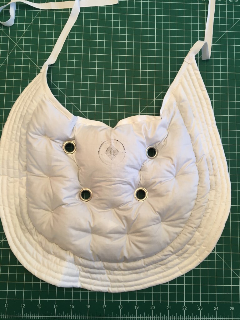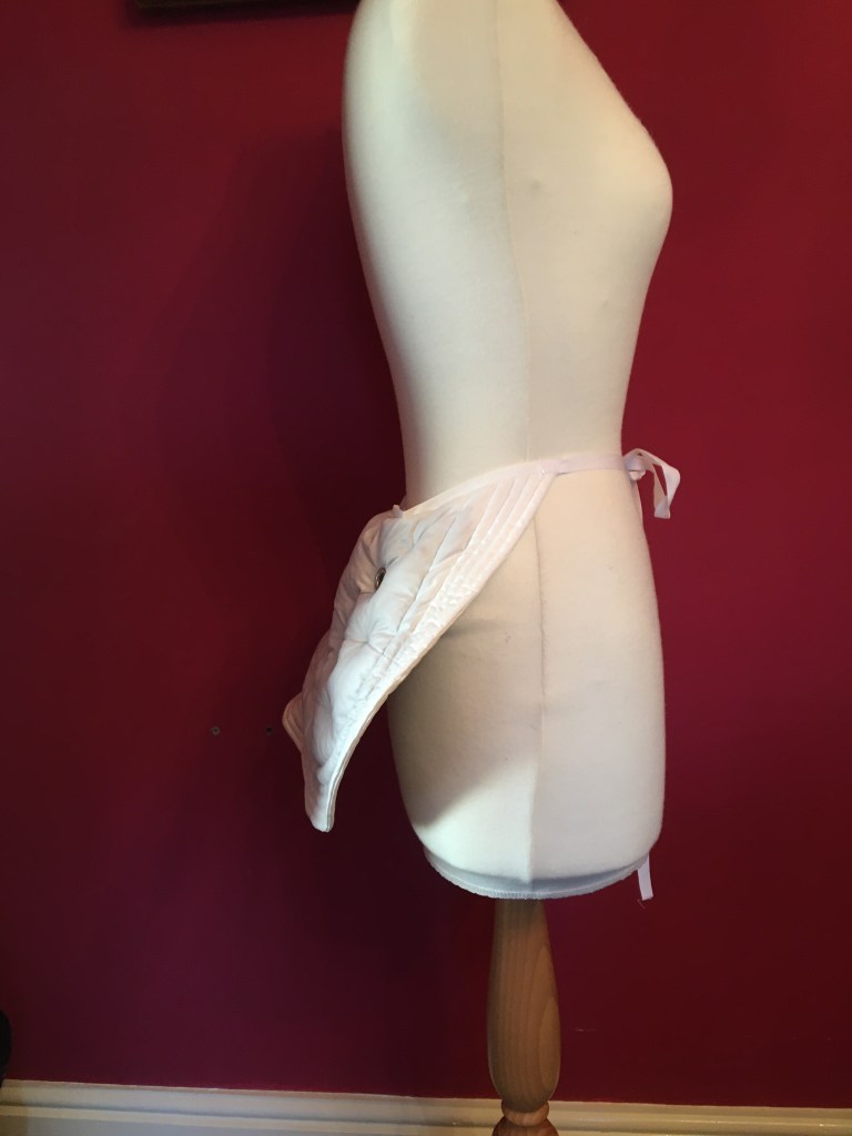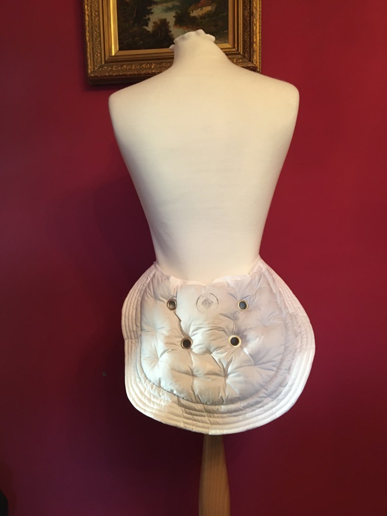 The innovation of ‘The Scott’ is the metal eyelets; it is “perforated so that the heat of the body and air may pass through” and “shall not be uncomfortably warm for the wearer”. However, if one does not have metal eyelets, the patent also states that the openings “may be worked around their edges like buttonholes” with “two pieces of gauze or reticulated material” between the two coverings for ventilation. In addition, it states that “the bustle and hip-form is tufted as usual”. Tufting prevents the stuffing from shifting and creates the dips in the pad that allow air to move away from the body.