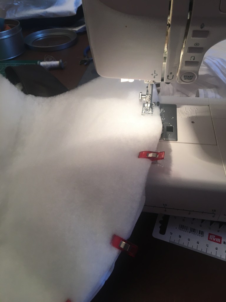 Step Three: Quilting. To create the ‘feathered edge’, sew 3/8″ (I used the edge of the presser foot) from the edge and then another 3/8″ from that one to create the first two channels. Next, increase the thickness of the quilting by adding some stuffing along the sewing line and sew two more quilting channels, this time 1/2″ wide. For the final channel, add more stuffing and increase the width to 3/4″. I used quilters clips along the top to hold the stuffing in whilst putting the bustle under the machine. You should have five quilting channels.