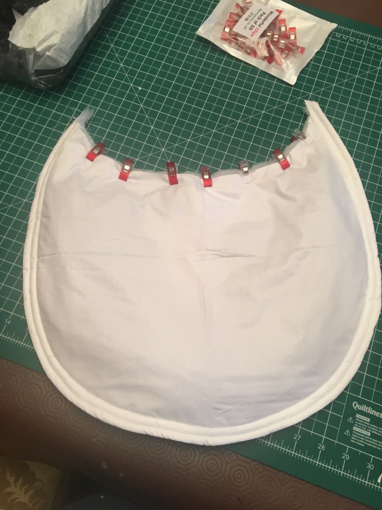 Step Five: Stuffing and closing the top. Finish stuffing your bustle to desired fullness using your batting offcuts and the rest of your stuffing. Put more stuffing in the middle of the pad to create a centre “enlargement”, as stated in the patent. Pin or use clips to close the opening and sew along the opening 3/8″ from the edge. Bind the top with bias tape or twill tape.