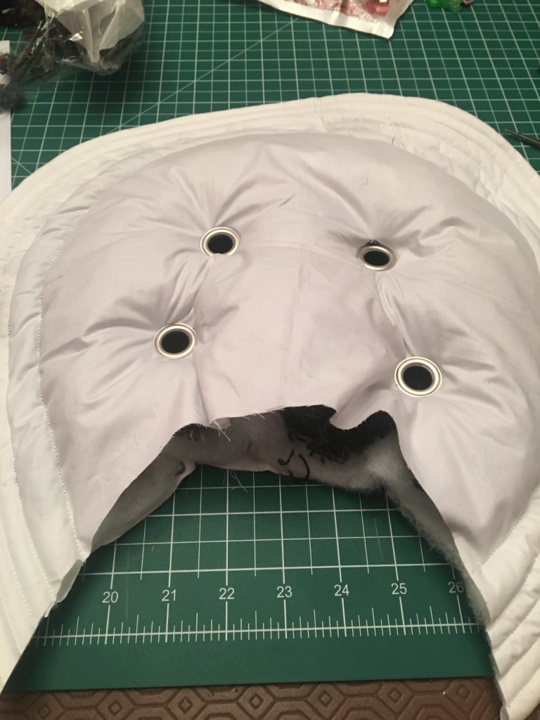 Step Four: Setting the eyelets. Using a fabric marker, mark where you want to place the grommets. Examples seem to have three to five eyelets spaced equally in a crescent shape in the centre of the bustle. Using a button hole punch or a sharp pair of embroidery scissors, make slits through all the layers. Be careful not to make the slits too big, you can always make them bigger but can’t make them smaller! Set the eyelets using the fixing tool included in the pack.