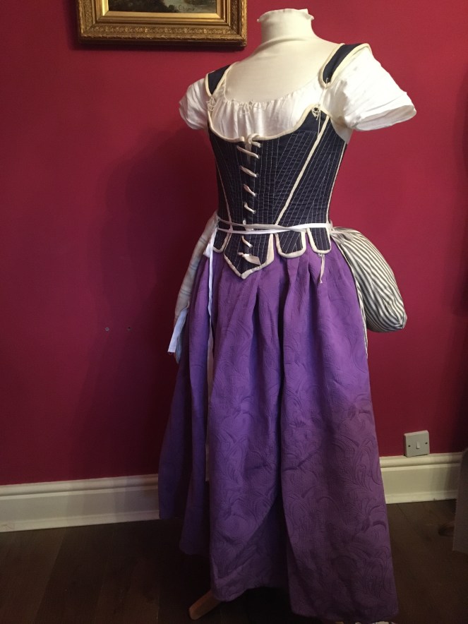 I dressed my mannequin in 1780s underpinnings which includes: a linen short-sleeved shift (1780-1810) based on an example in Costume Close-Up; a matelasse under-petticoat to give body to the skirts; my front- and back-opening boned stays; a pocket; and a false rump.