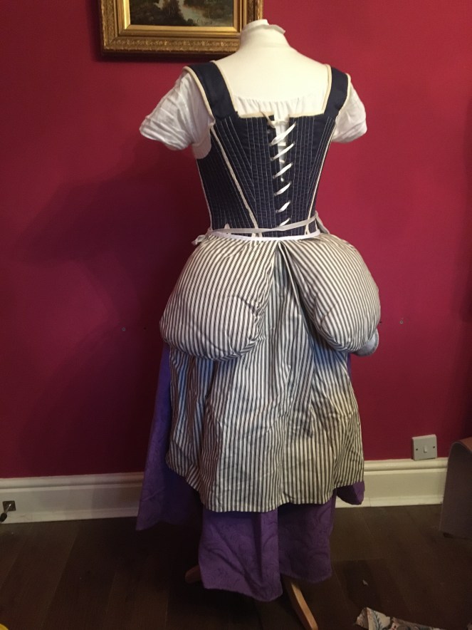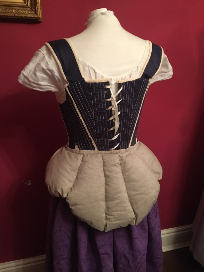 At first, I used my split rump, which I made for my Italian Gown following the instructions in The American Duchess Guide to 18th Century Dressmaking; however, I messaged Rebecca Olds (the lady behind the Isabella Project) and she informed me that the split rump is used for Italian Gowns; the deep ‘V’ of the Italian gown bodice rests between the pillows, but for a gown with the back cut in one with the skirt, “a little fullness” is required “across the back to support the weight of the fabric as it curves down”.