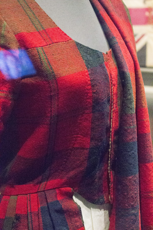 - Lacing strips: other example of this type of robe a l’Anglaise with centre-front closing usually pin together at the front but the Isabella gown has lacing strips on the inside front. These were probably added to support the weight of the heavy tartan fabric.