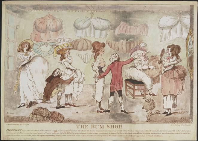 There are almost no original skirt supports surviving from this period. I based the false rump on one of the rumps in the satirical print ‘The Bum Shop’ from 1785 and using this great research into recreating late eighteenth-century skirt supports by Kendra Van Cleave. As well as the split rumps, in the satirical print, there are examples of false rumps which are more crescent shaped with vertical quilting. In addition, the crescent also seems to come around to gives some fullness to the hips: for example, the lady on the furthest right. Some of the examples in the print have a underpetticoat attached, but reading Van Cleave’s research, I left it off because she reported it did not make much difference to the final silhouette. As far as a satirical print can be accurate, I took the brown and dark pink of the rumps to indicate linen, so felt my sturdy linen was an appropriate choice.